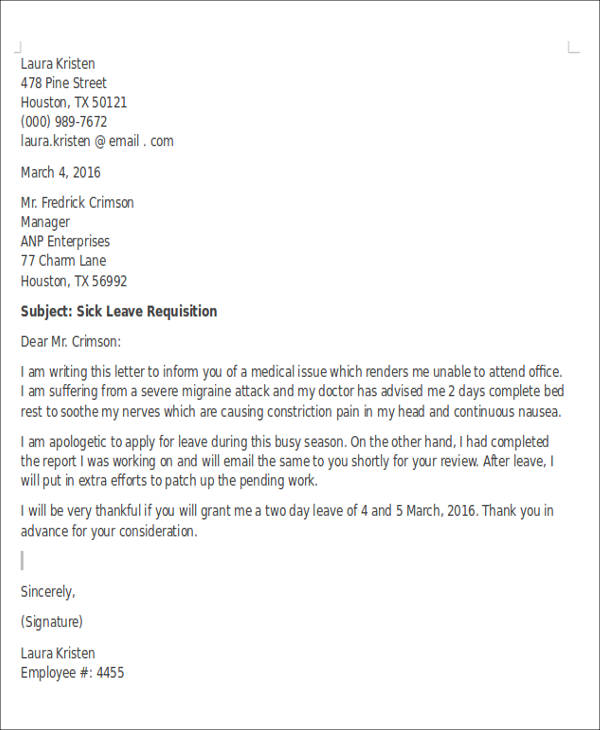 - State your purpose for writing: "I am writing to request a sick leave from work."
